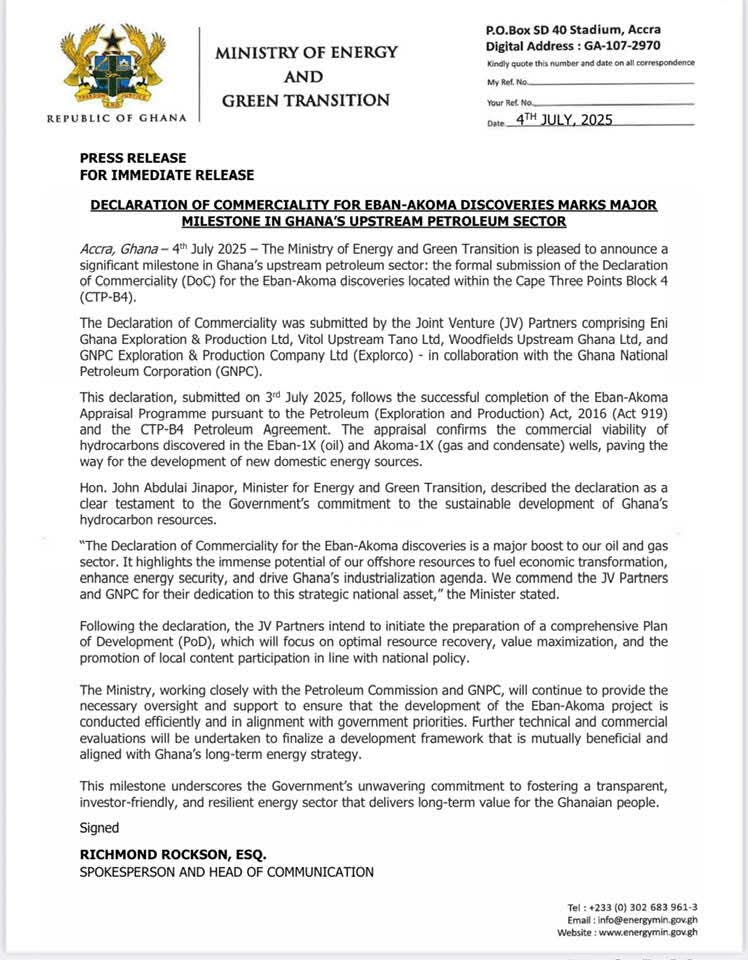The announcement, made on July 4, 2025, by the Ministry of Energy and Green Transition, confirms that the Eban-1X and Akoma-1X wells, containing oil, gas, and condensates are commercially viable for development. This means Ghana is now positioned to unlock another layer of domestic energy resources, with direct implications for energy supply, jobs, and household stability.